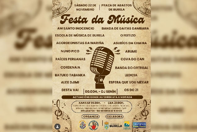 O evento terá lugar o sábado 22 de novembro na Praza de Abastos, con sesións musicais dende as 13:00 horas ata a noite e dúas comidas de confraternidade