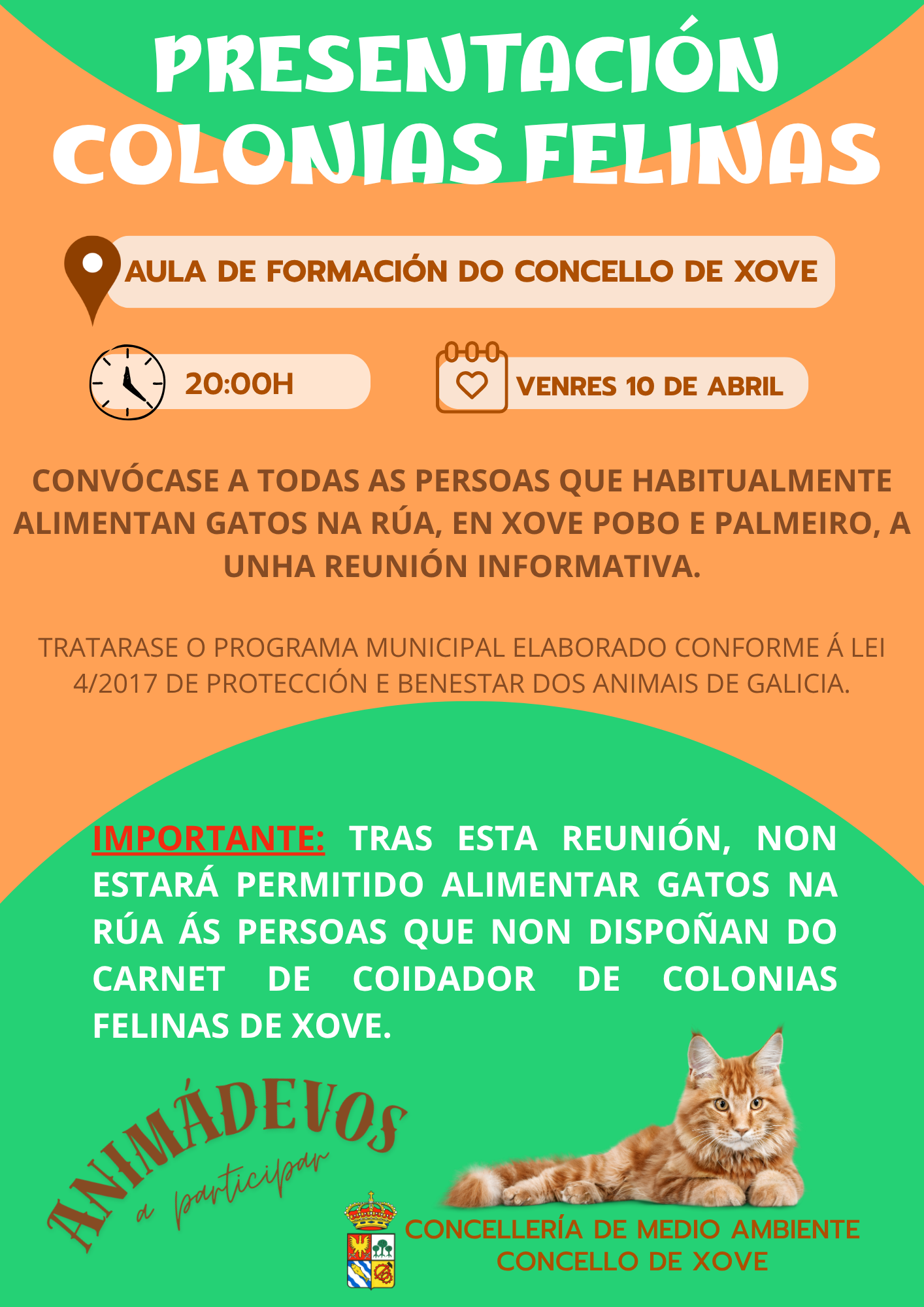 A clave do cambio está en que, unha vez celebrada esa reunión, xa non se permitirá alimentar gatos na vía pública sen dispoñer do correspondente carné de coidador/a de colonias felinas. O Concello sostén que a medida busca garantir unha convivencia adecuada, protexer o benestar animal e asegurar unha xestión máis coordinada e responsable das colonias existentes no termo municipal.
