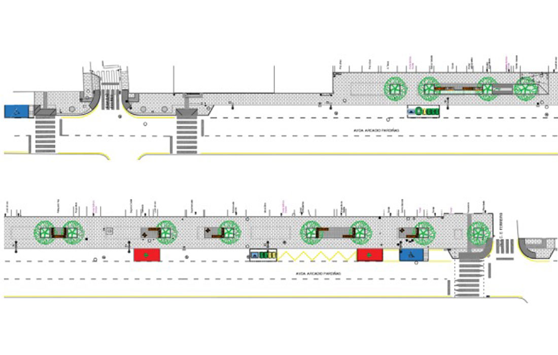 O proxecto céntrase na renovación das beirarrúas e na optimización da accesibilidade nos cruzamentos peonís, co obxectivo de ofrecer un espazo máis cómodo e seguro para a veciñanza. Na zona existen cinco pasos de peóns —tres deles regulados por semáforos— nos que se ampliarán ou executarán novas “orellas” laterais e se incorporará pavimento podotáctil para facilitar o tránsito de persoas con mobilidade reducida ou diversidade funcional.