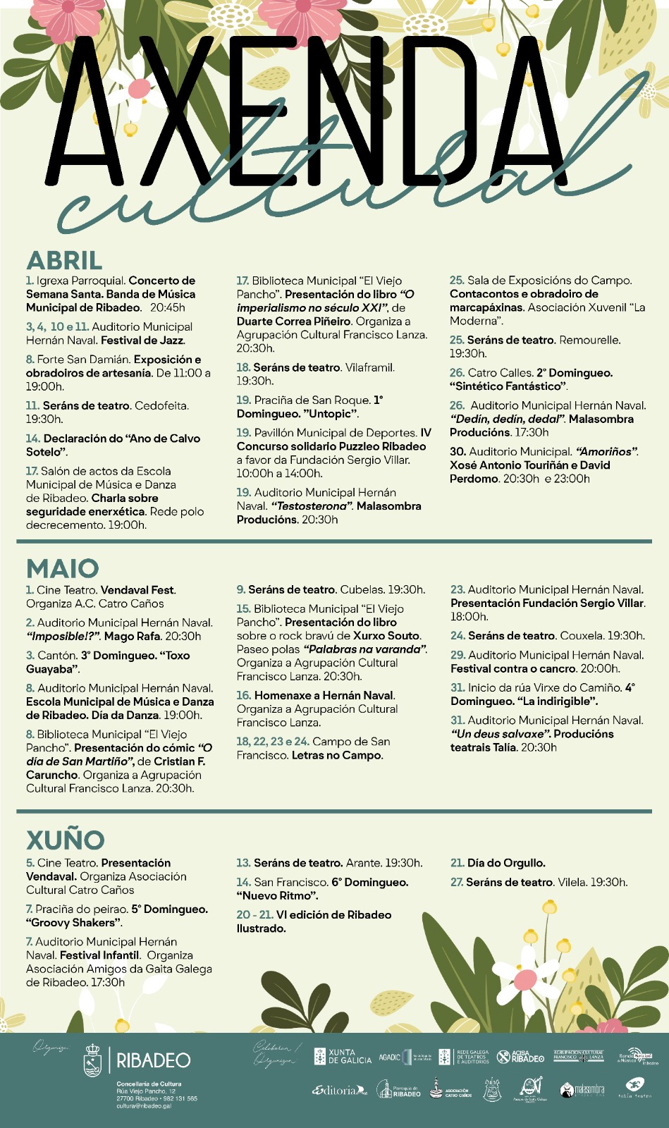O Concello de Ribadeo vén de presentar a súa programación cultural de primavera, unha proposta ampla que reúne máis de trinta actividades ao longo dos meses de abril, maio e xuño. A iniciativa busca consolidar unha oferta variada e accesible, dirixida a públicos de todas as idades e repartida por diferentes espazos do municipio.